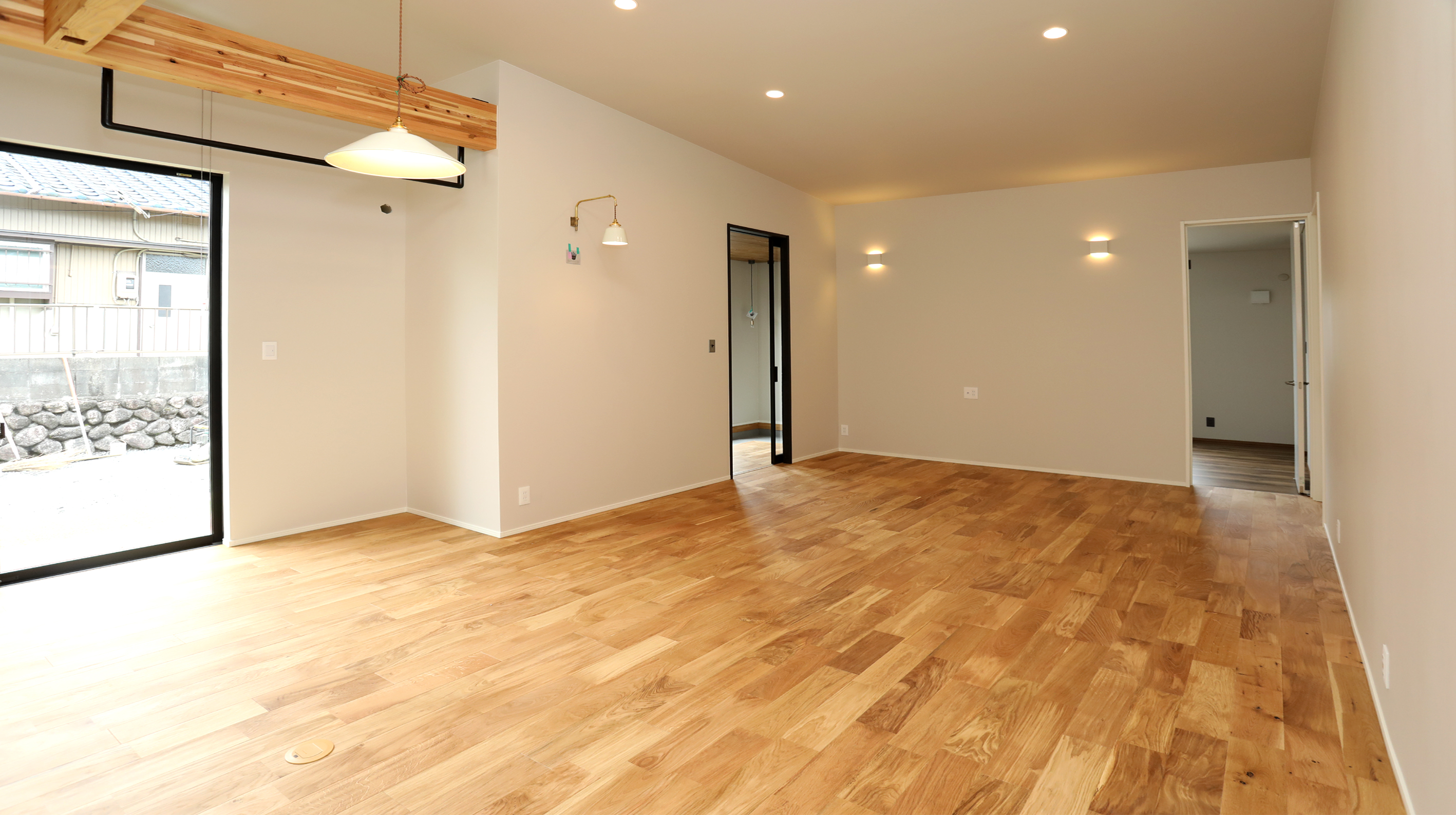 リビングは白を基調に梁見せやナラの無垢板を使い、奥様こだわりの照明器具がとても素敵にマッチし、ナチュナルでシンプルなテイストに。