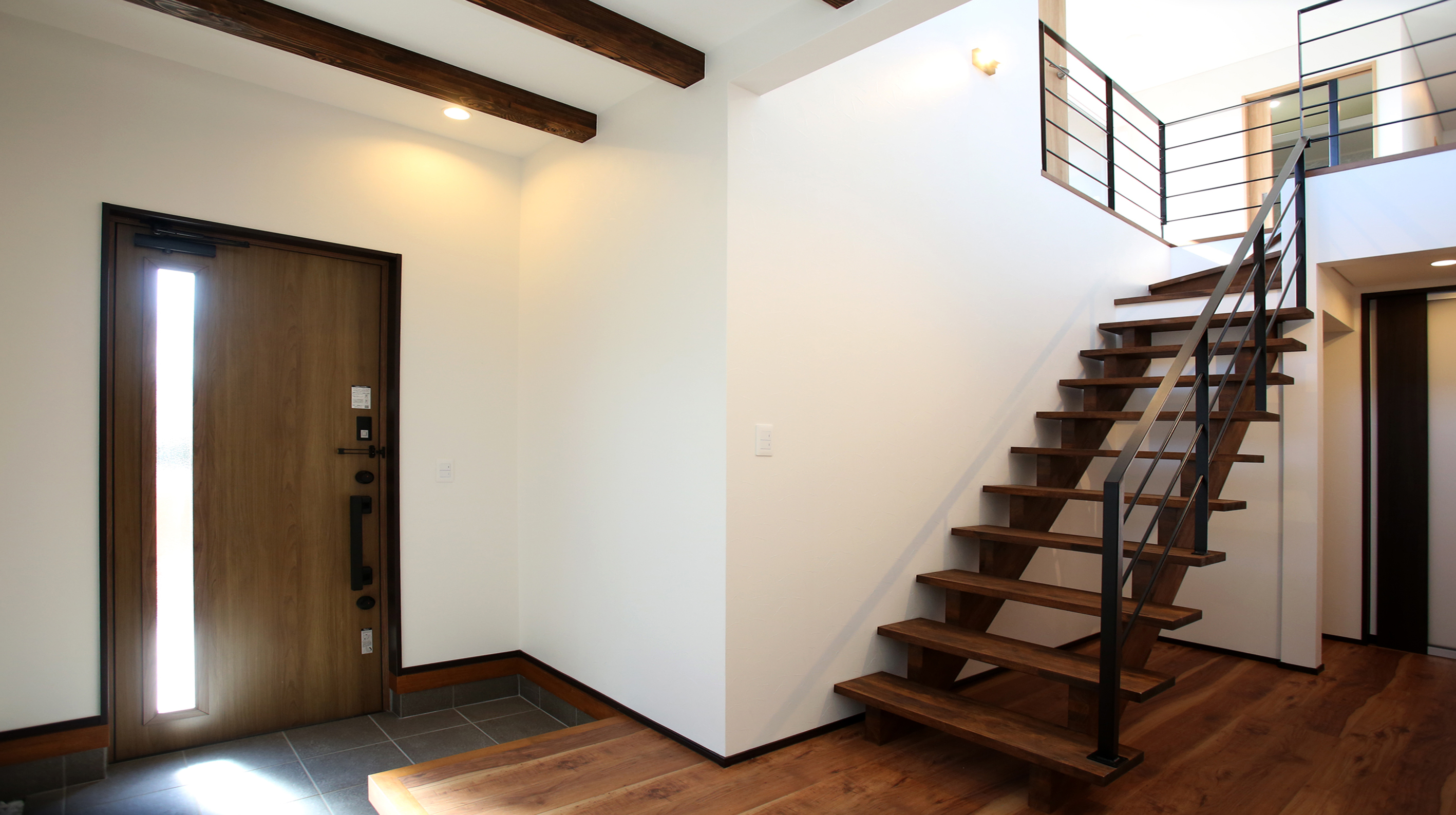 2階は洋室2つ、主寝室、納戸等があり、階段は吹き抜けで1階の玄関から2階まで解放感あふれ、吹き抜けに大きな窓を設けたので光が差し込み明るく解放感ある雰囲気になりました。
