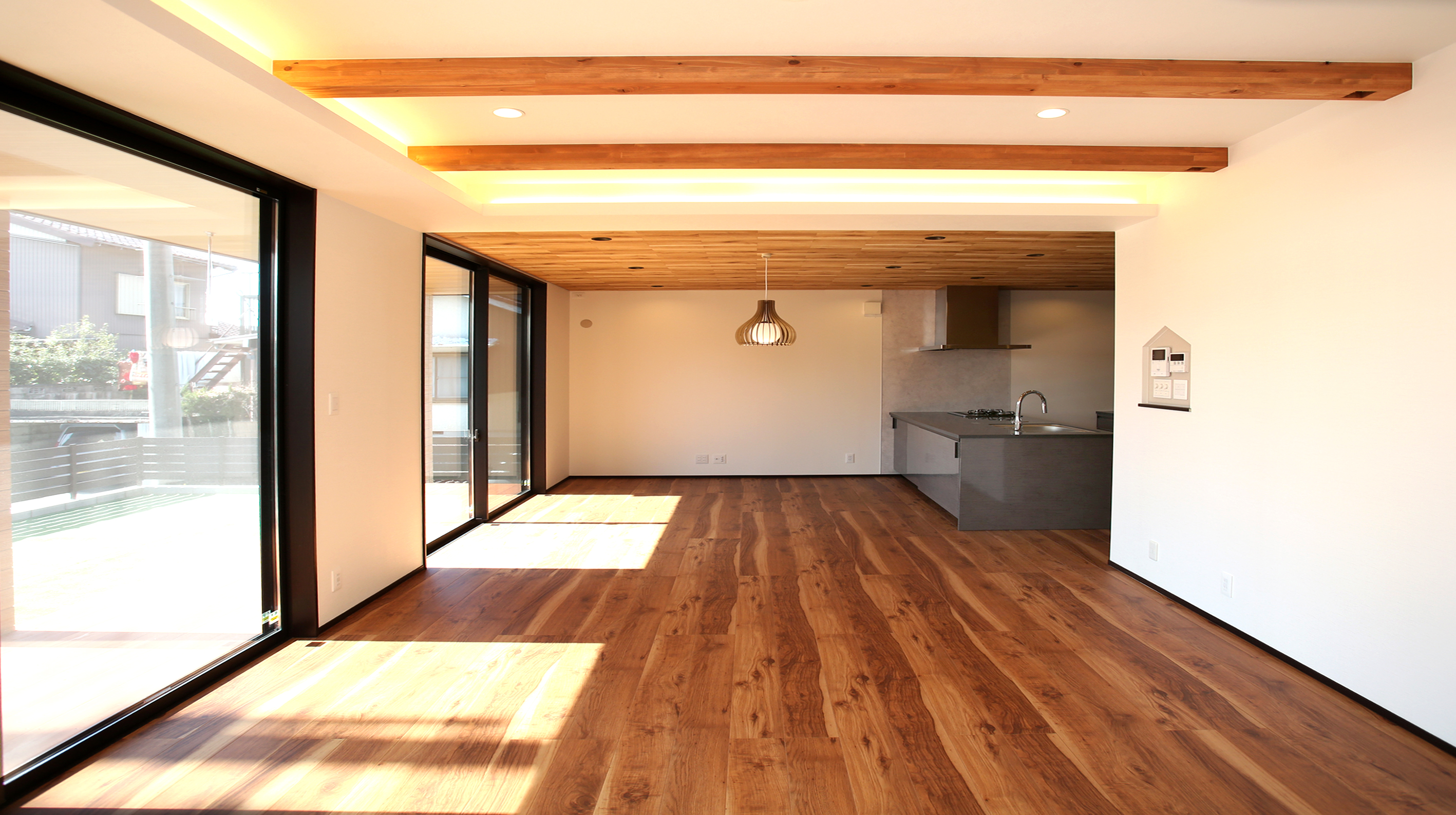 リビングは梁見せ、間接照明で暖かく、落ち着いた雰囲気に。