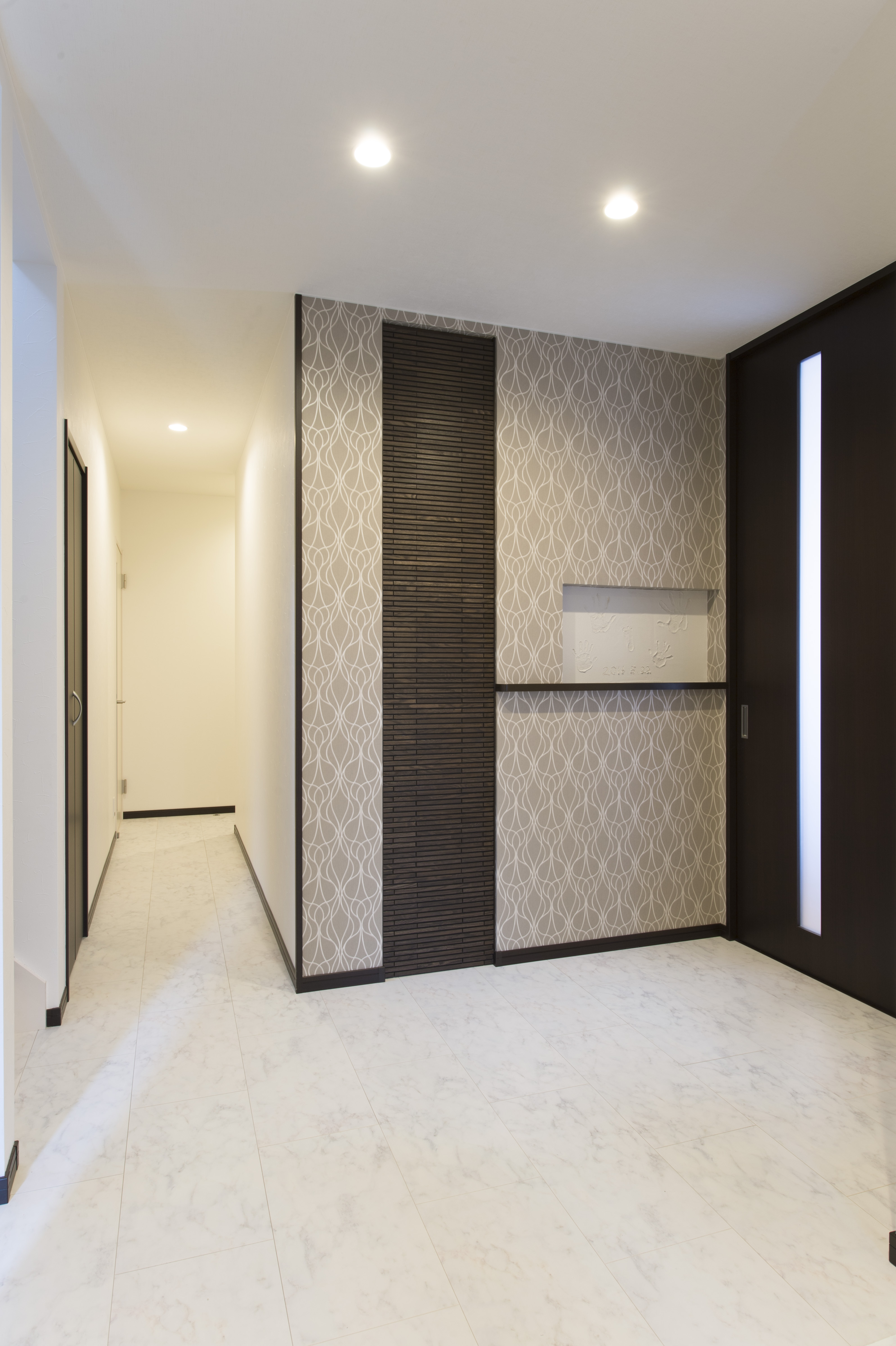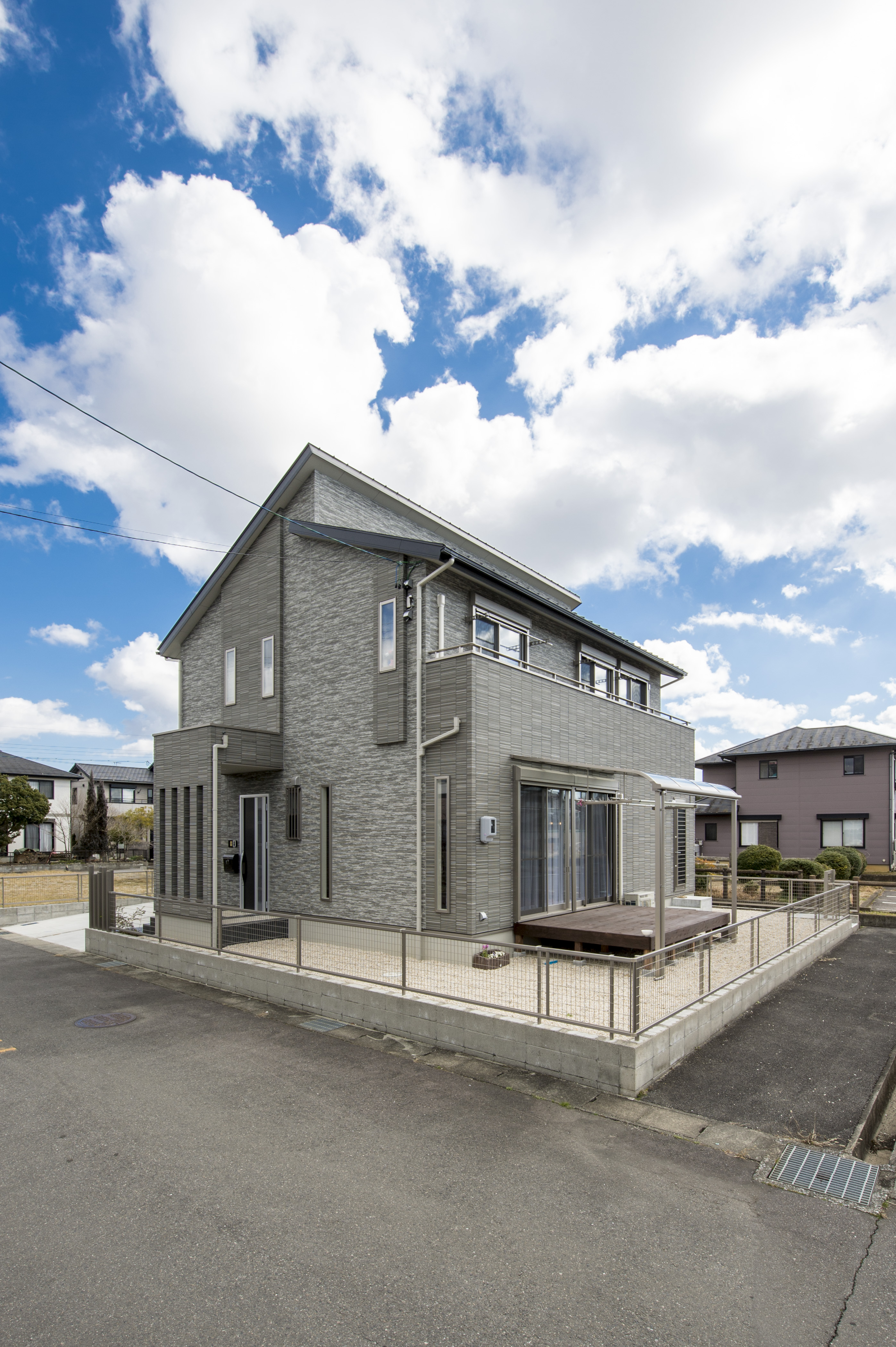 外観は2色のグレー素材の外壁で落ち着いた雰囲気に仕上げ、凸凹を造り立体感もプラスさせて頂きました。